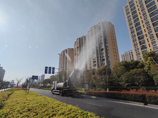 “空中”清洗,“洗”出清新氣。隨著春季氣溫的升高,兩臺(tái)搭載大型“霧炮”的多功能抑塵車每天“不辭辛勞”地在園區(qū)主次干道上緩緩行駛,噴射出的水霧在陽(yáng)光照射下劃出一道道絢麗的彩虹,不僅裝扮了城市之美,更能有效“捕捉”空氣中PM2.5、PM10等懸浮顆粒,使空氣更加清新。